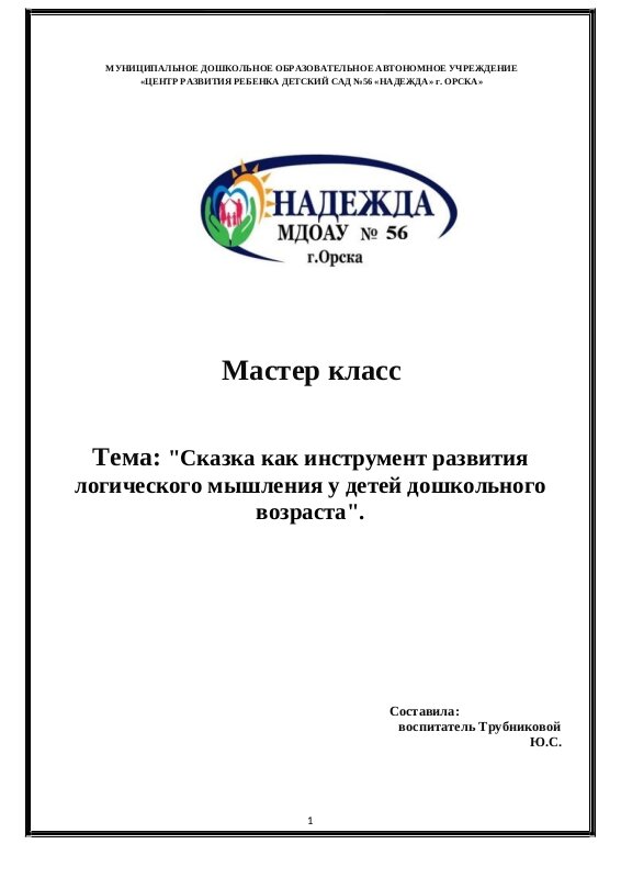 «Сказка как инструмент развития логического мышления у детей дошкольного возраста »