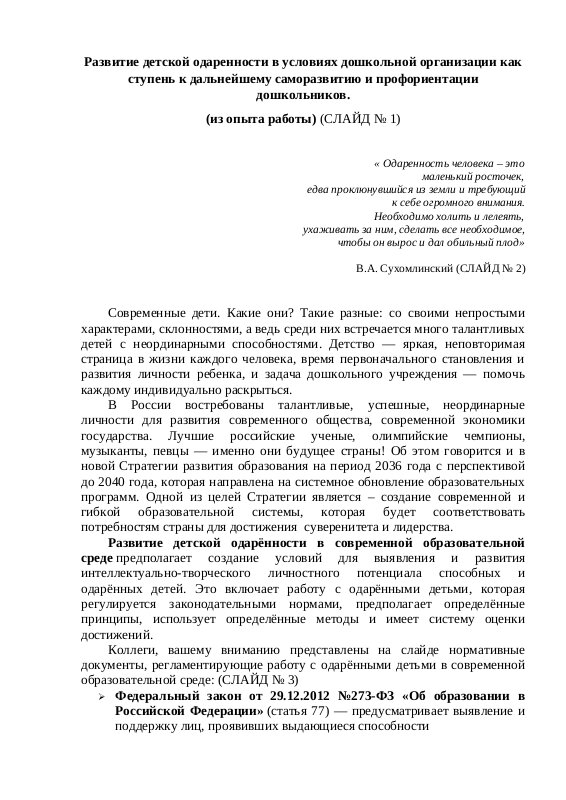 Выступление по проблеме: "Развитие детской одаренности в условиях дошкольной организации как ступень к дальнейшему саморазвитию и профориентации дошкольников."
